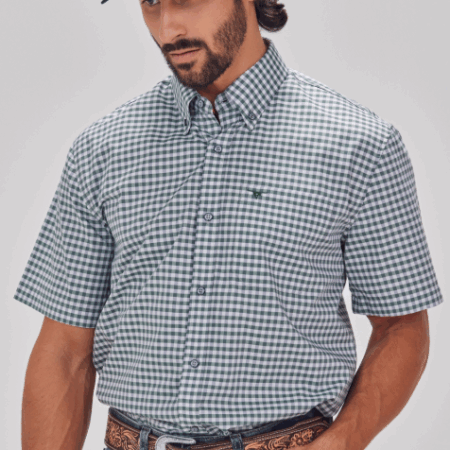 • Camisa Masculina Manga Curta Custom Fit Xadrez – Verde Cinza 3208