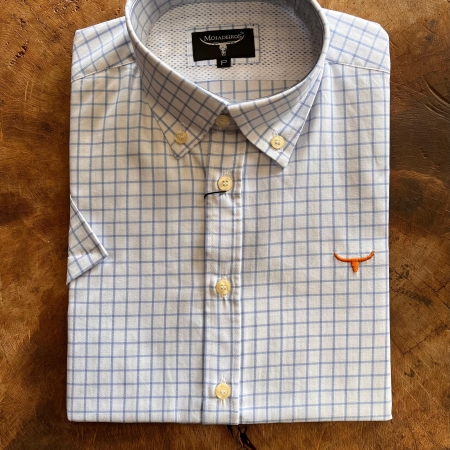 • CMC2477 CAMISA MC BRANCO QUADRICULADO AZUL/LOGO LARANJA