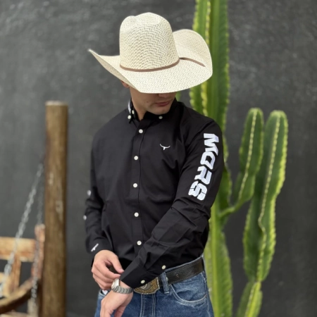 • CML2411 CAMISA ML PRETO BORDADO BRANCO